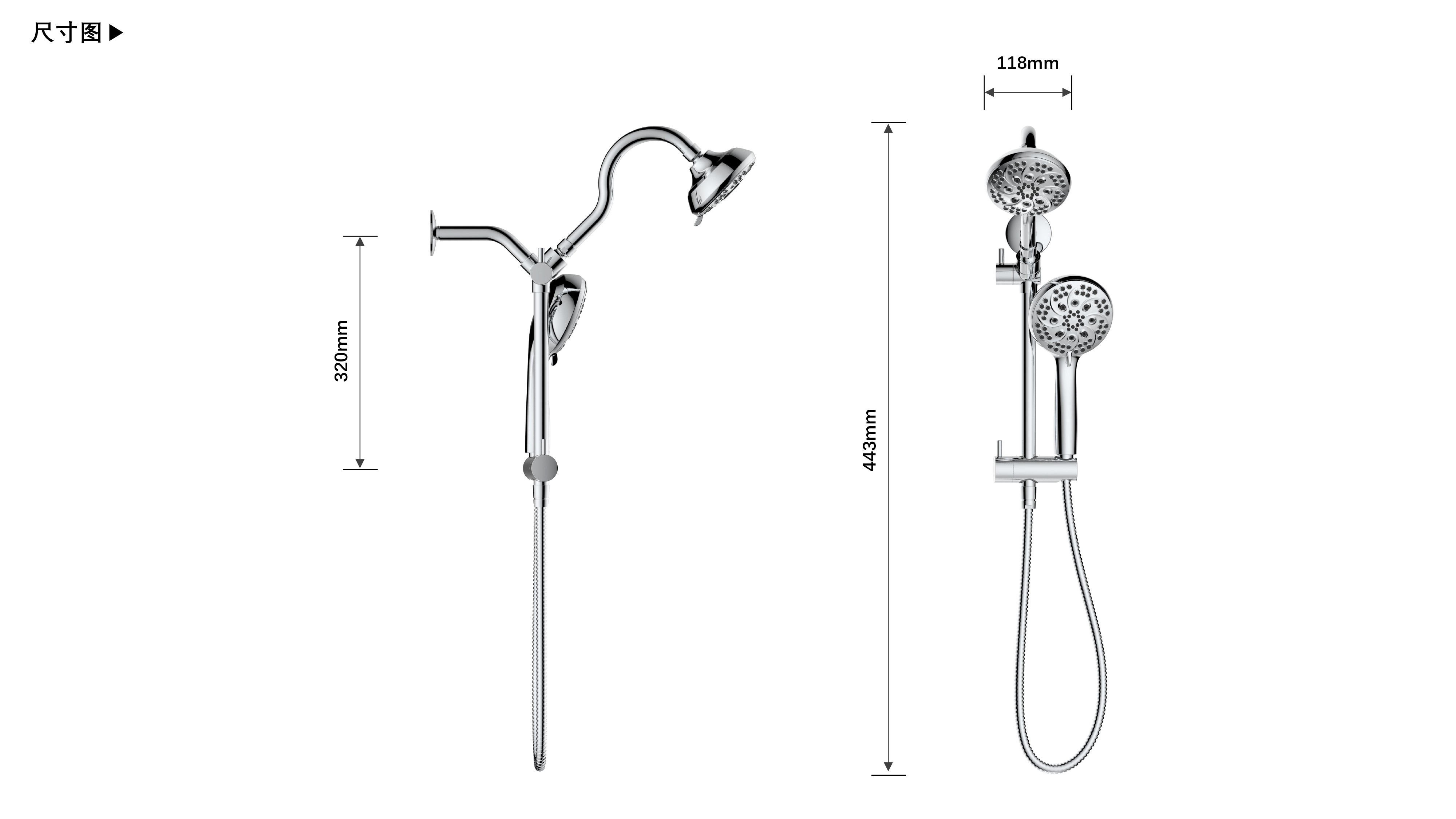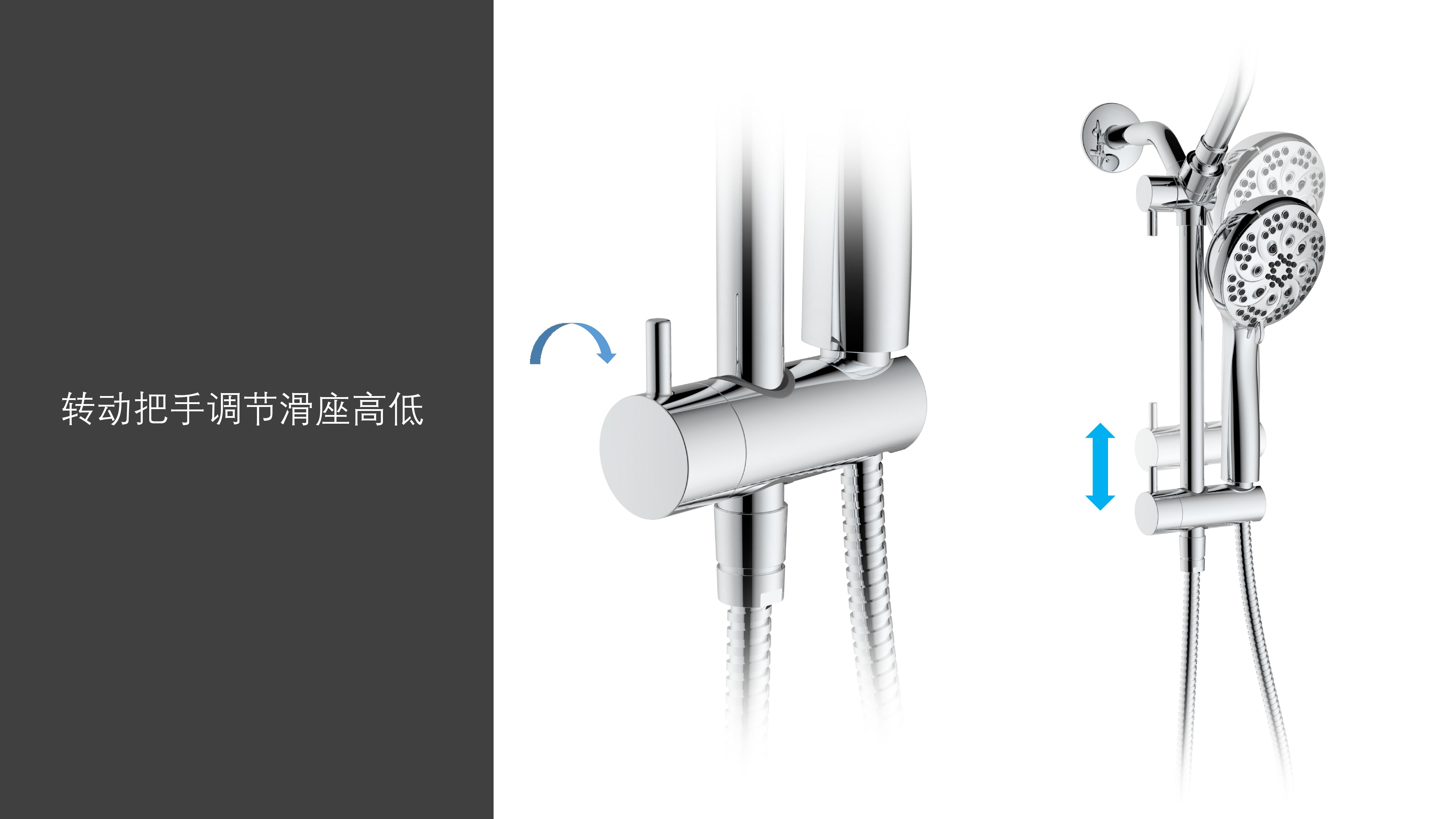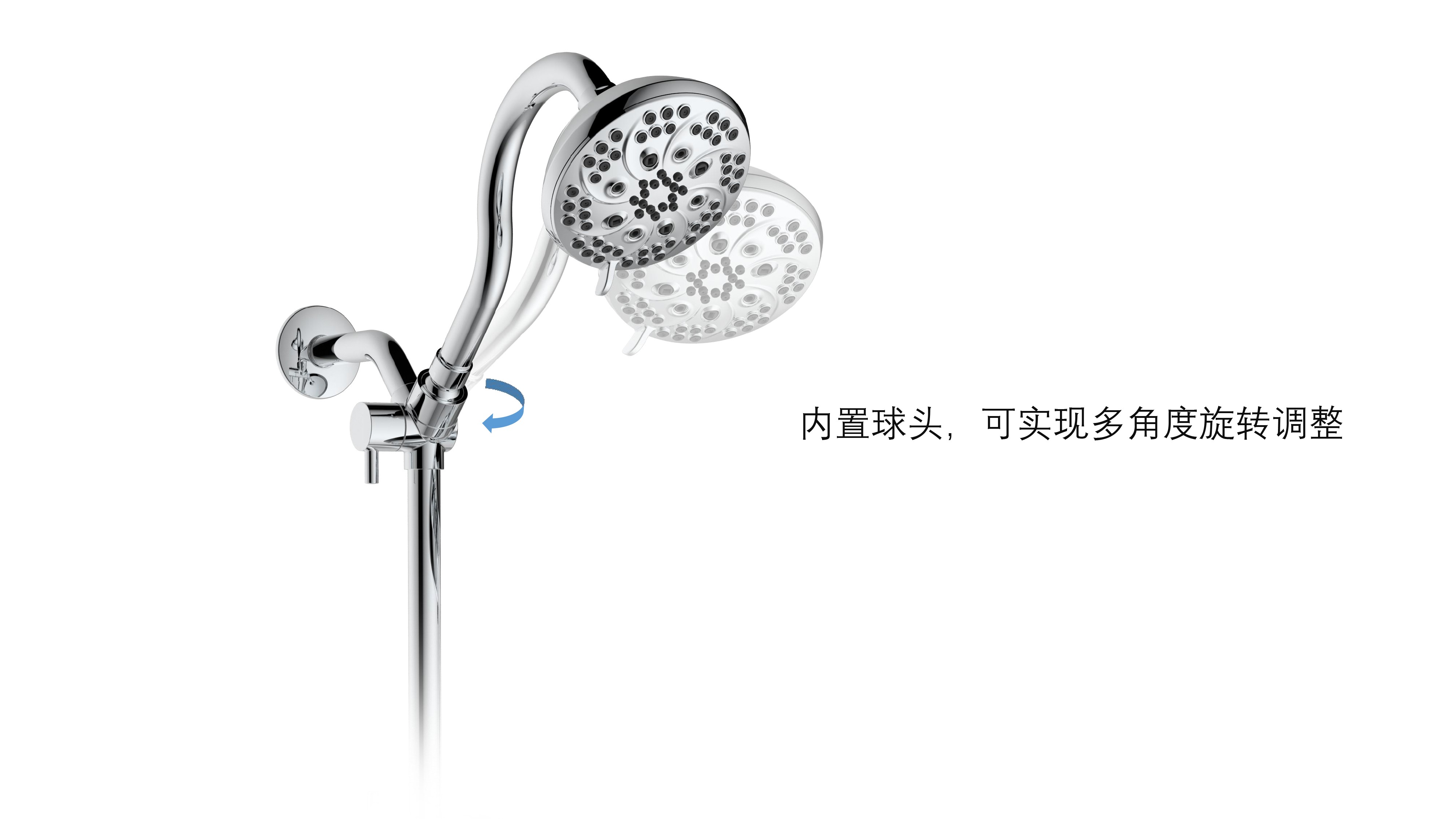 上出水彎管套裝;頂噴內置球頭,可實現(xiàn)多角度旋轉調整;把手切換頂噴出水、花灑出水;轉動把手調節(jié)滑座高低;8功能出水花灑