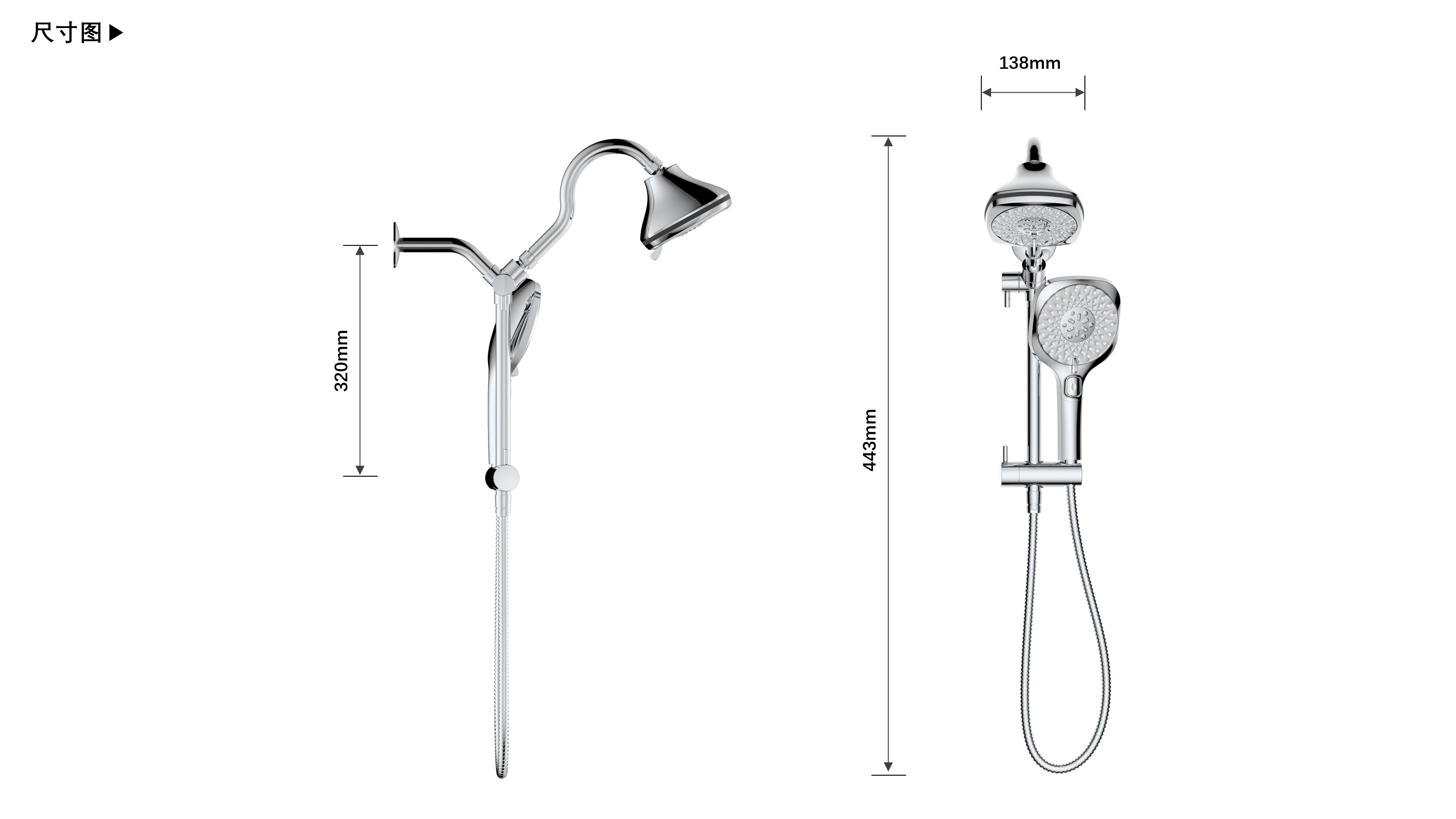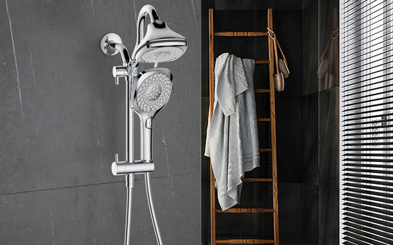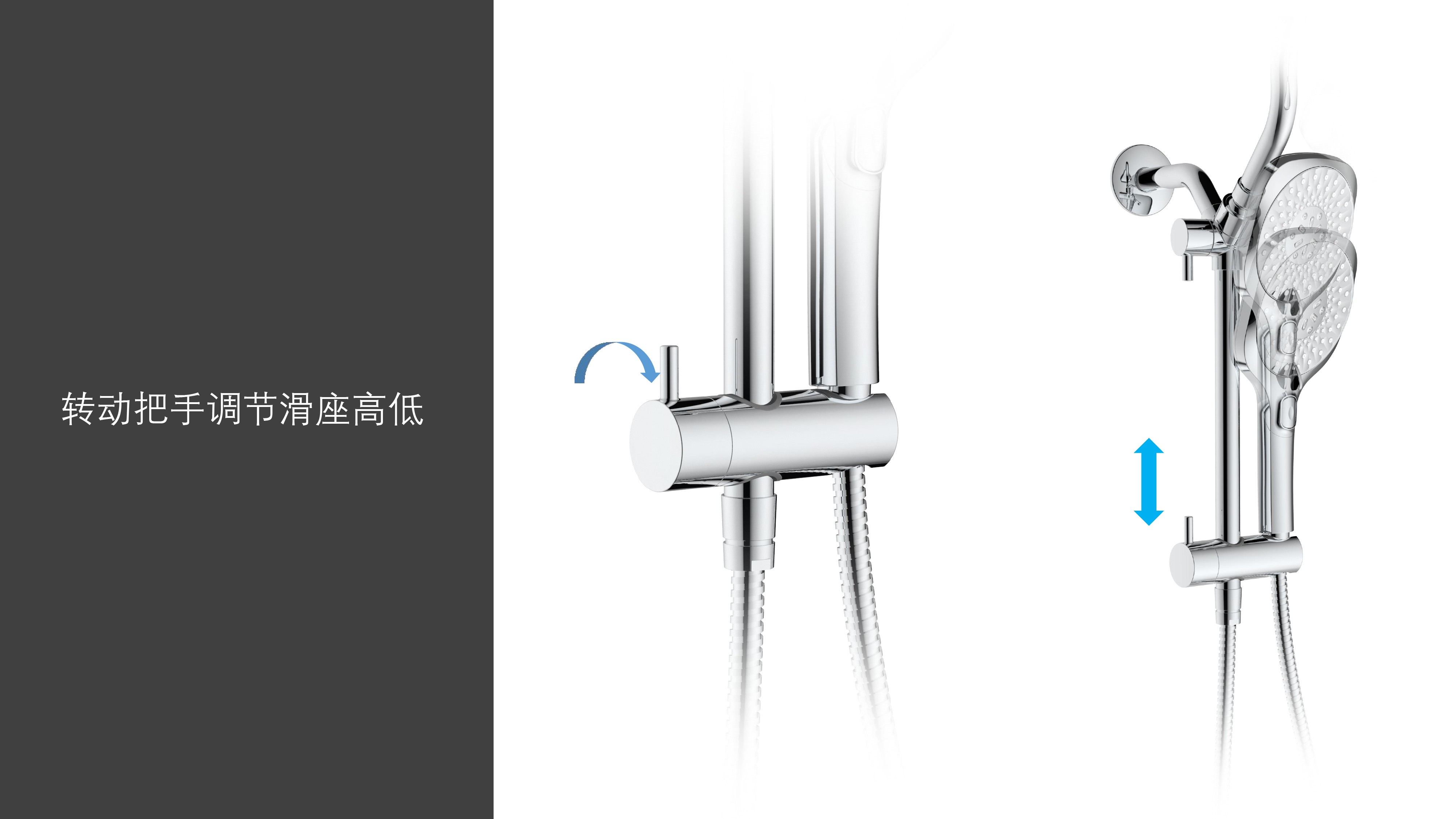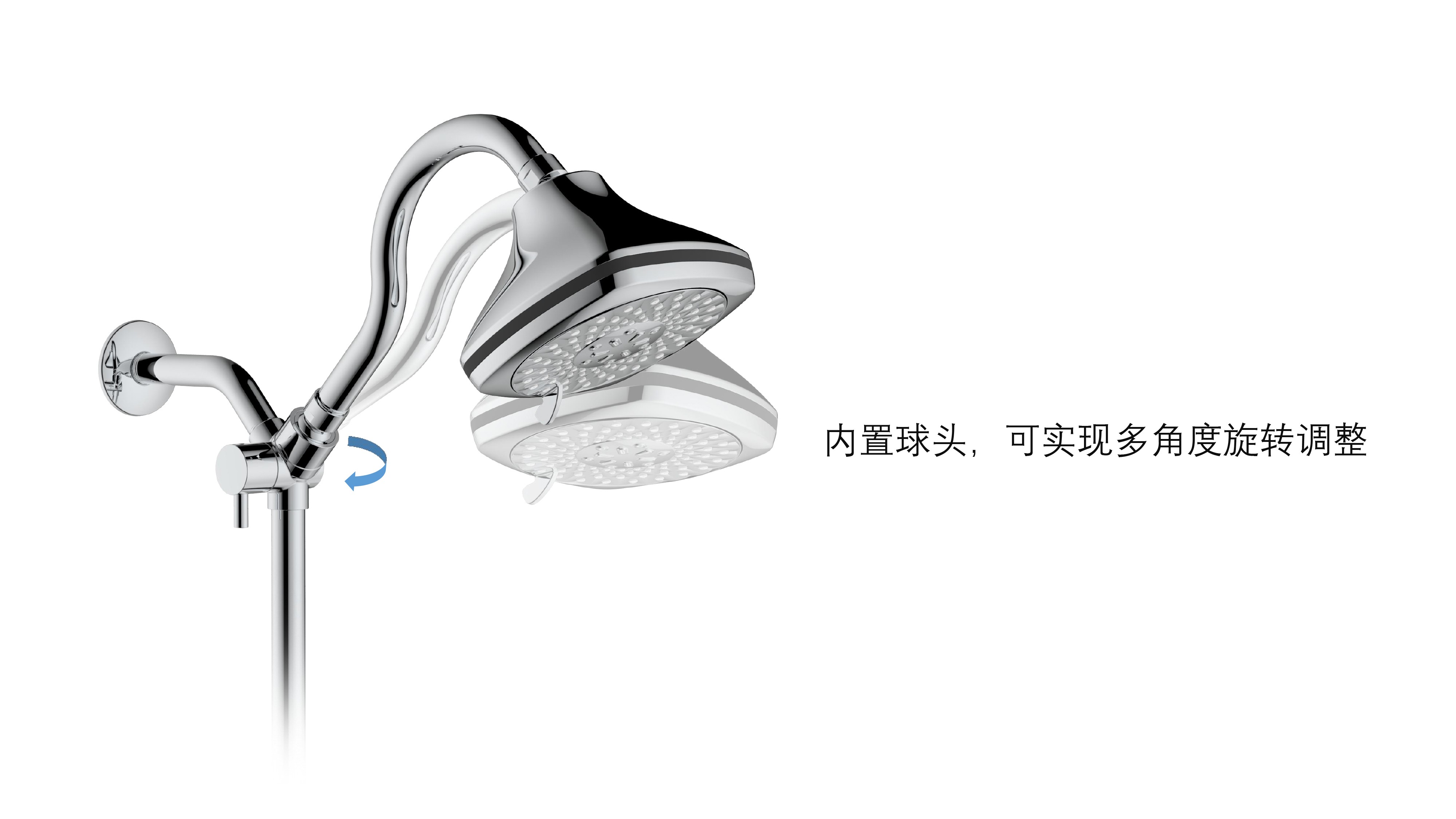 上出水彎管套裝;頂噴內置球頭,可實現(xiàn)多角度旋轉調整;把手切換頂噴出水、花灑出水;轉動把手調節(jié)滑座高低;8功能出水花灑